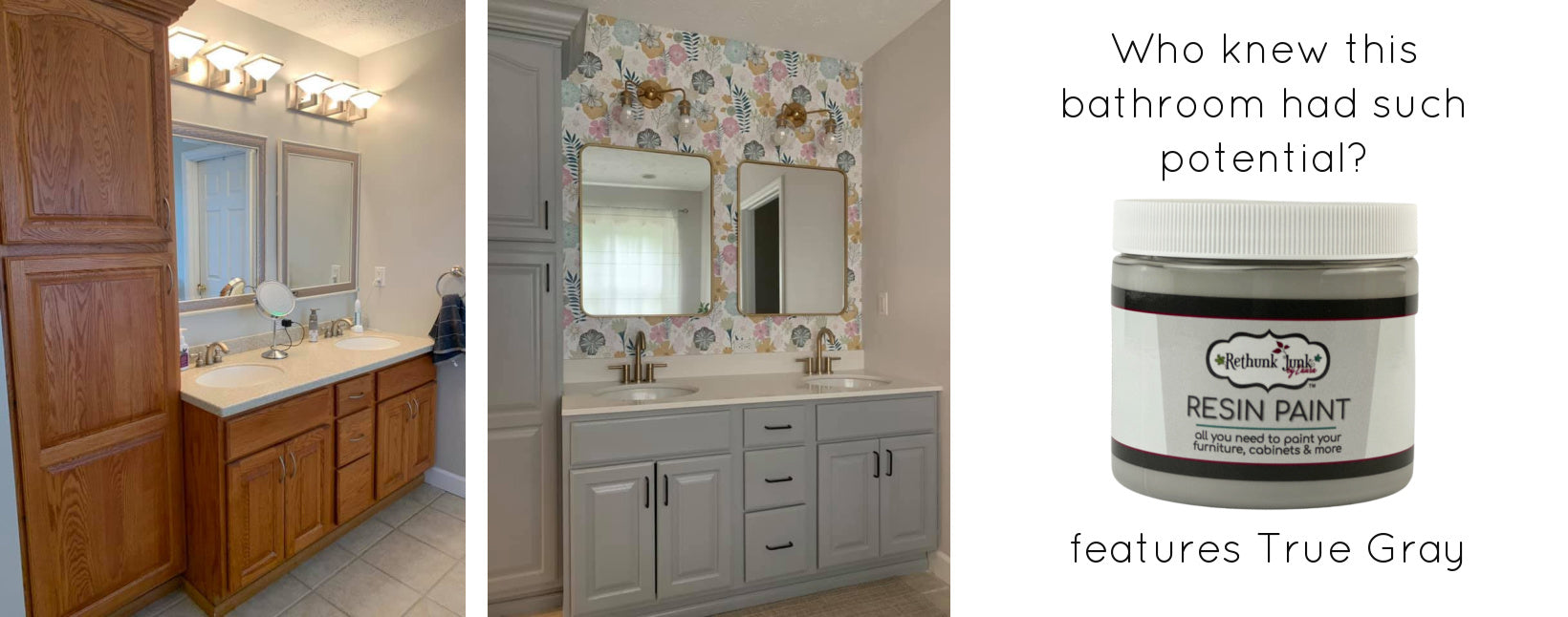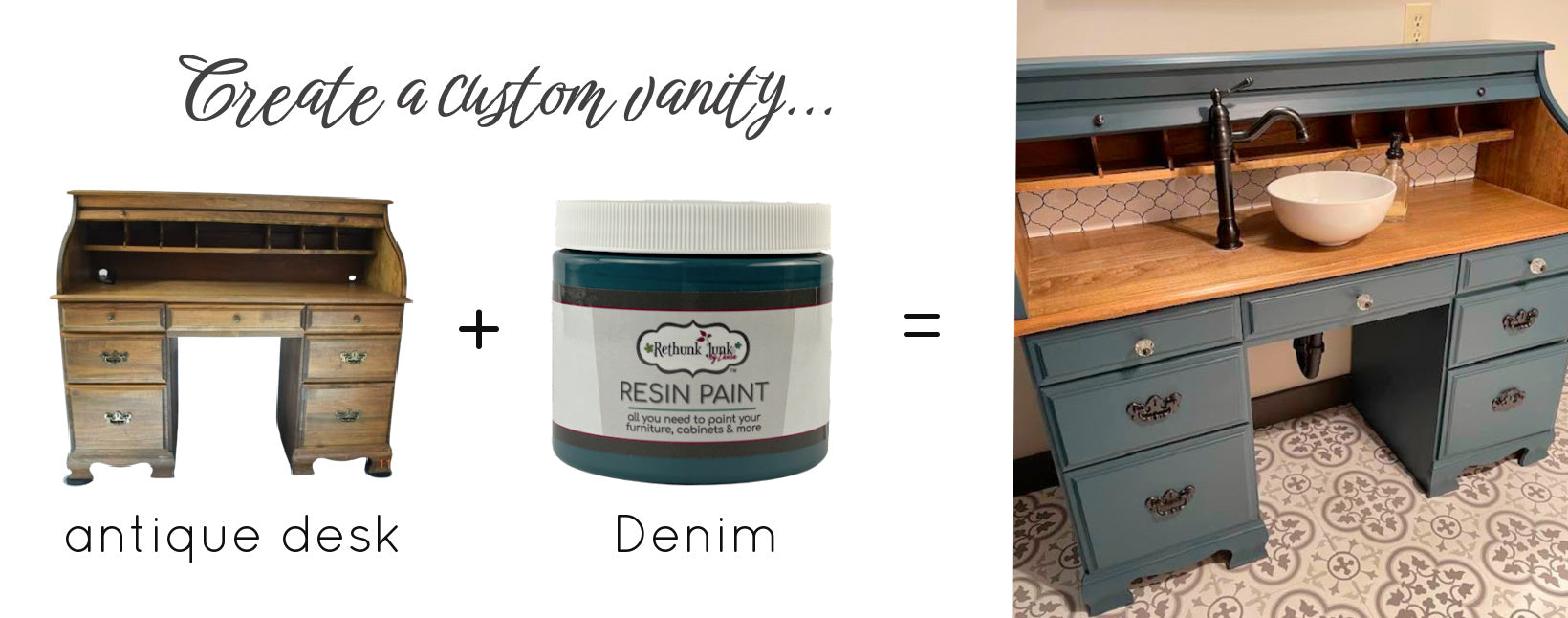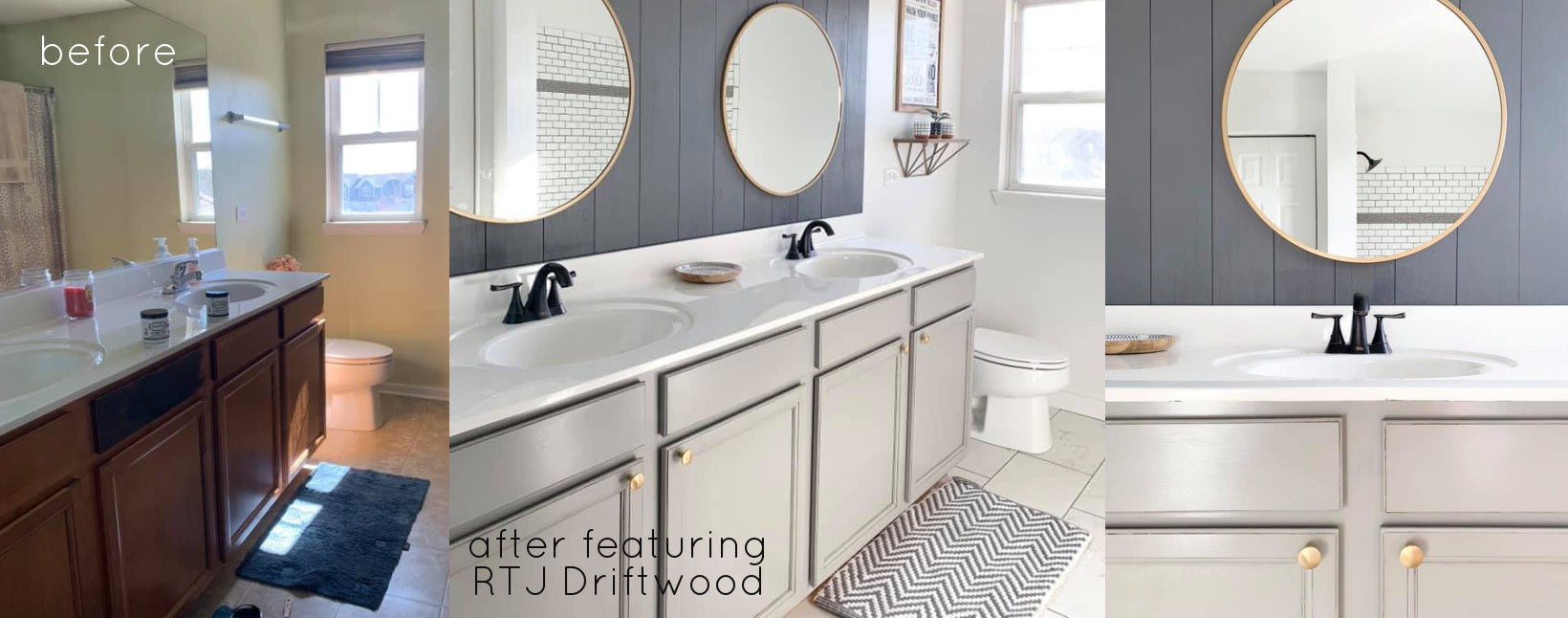 We love using Rethunk Junk by Laura® to update bathroom vanities! It's a quick and easy project with a huge return. Get rid of that outdated orange oak or those dark maple cabinets and give your bathroom the refresh it deserves. Plus, bathroom vanities are a fun place to use an unexpected color like Farmhouse Navy, Eucalyptus or any of our other 48 fabulous colors. Have fun!