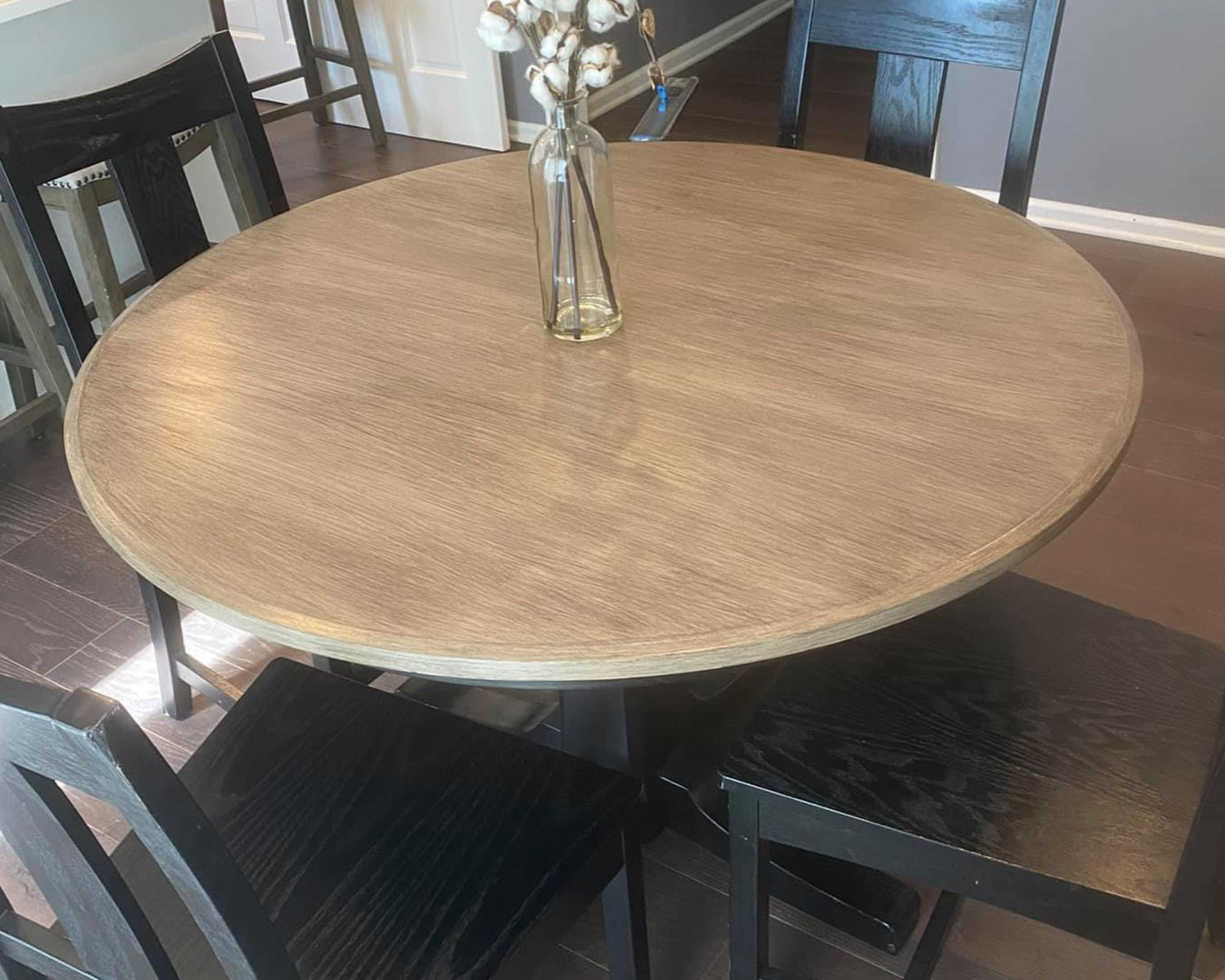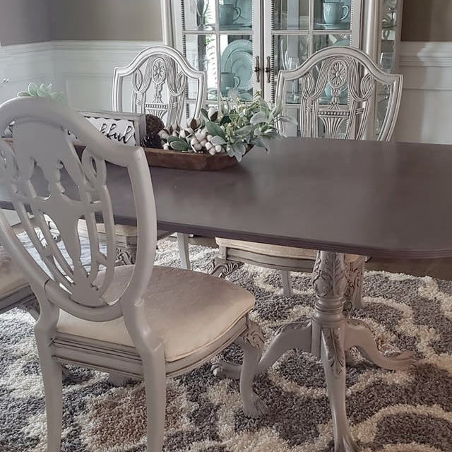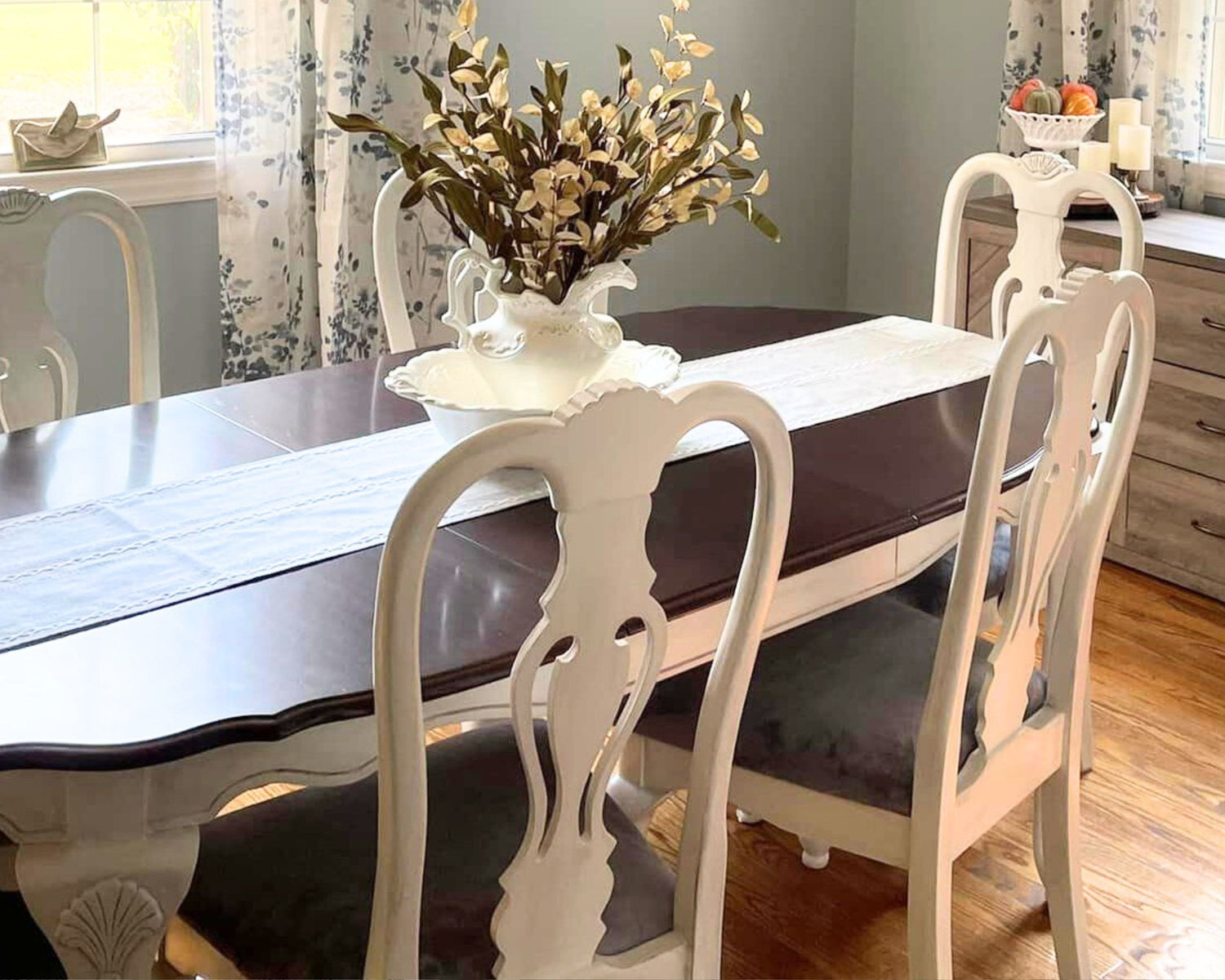 Create this classy look with just a few products. Start by cleaning your whole set with The Prep & scrubby pad. Then use our Dark Walnut Stain Top to create a rich, deep brown table top. Paint your chairs & table base with Oyster or Linen. Then finish your project by applying Tuff Top to the table top for added protection & durability! Take all the money you saved & buy a lovely centerpiece! Voila!