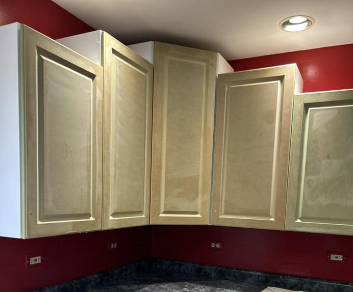 Once the Thermofoil sheets have been removed, you will find an MDF surface on the doors and drawers. This surface does not need anything done to it to be ready to paint with Rethunk Junk by Laura®. However, the rest of the cabinet including backs of doors and the body of the base will need to be cleaned well with our PREP and a scrubby pad to remove all residue and prepare for the paint.