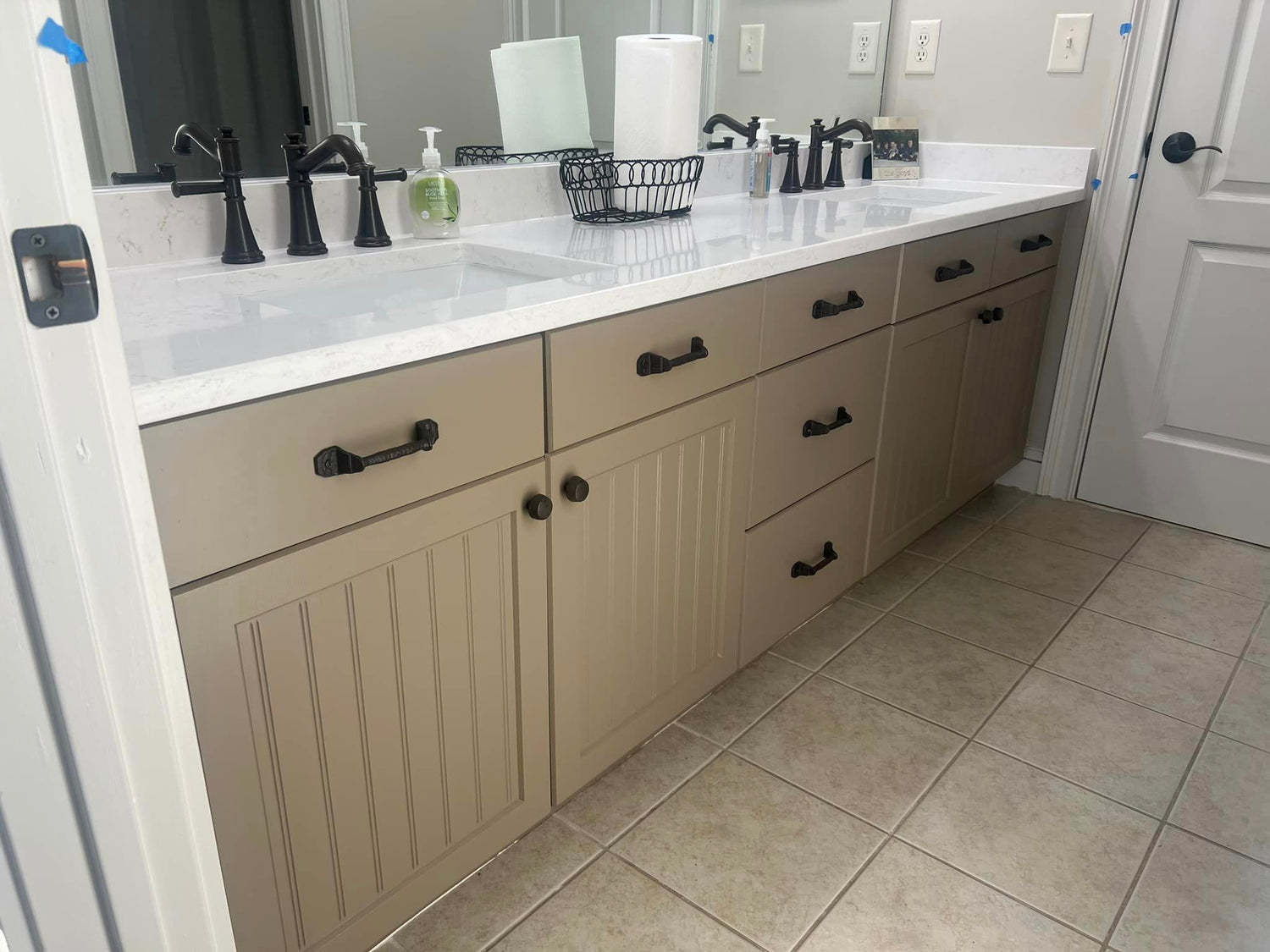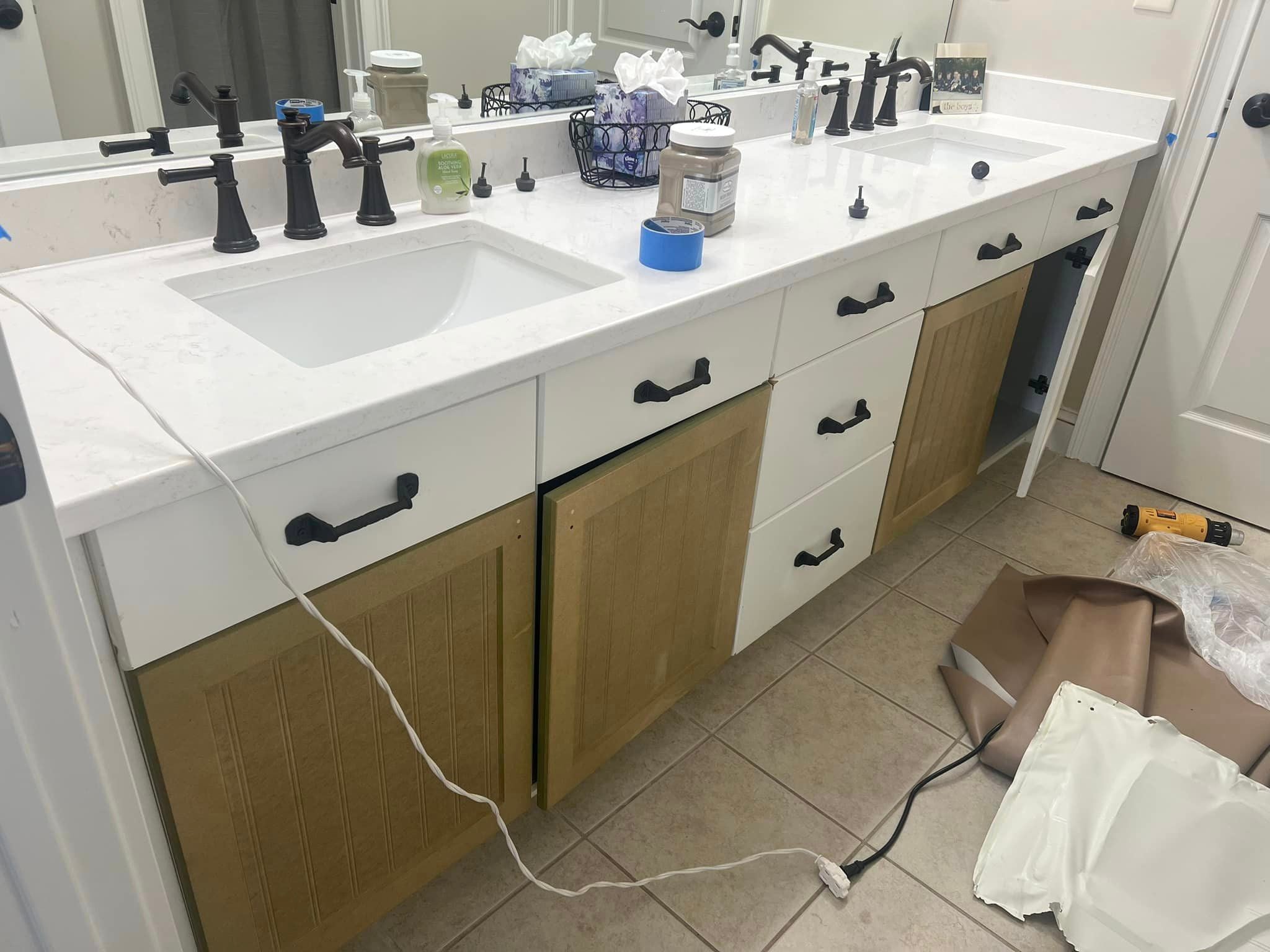Look at these customer before and after photos of a bathroom vanity Thermofoil removal & makeover! You can complete a project like this in one evening...for less than $60! Just snag the Bathroom Vanity Bundle & get started!