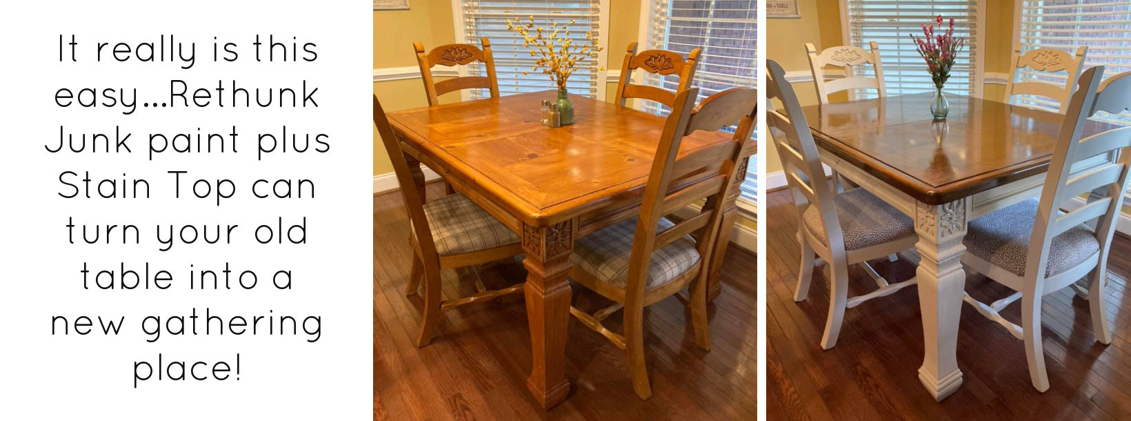 Rethunk Junk by Laura® Stain Top can restore your wood finish to beautiful in just two steps- no messy stripping or sanding needed! Our transparent formula allows the wood grain to show through while hiding the flaws and restoring the finish.