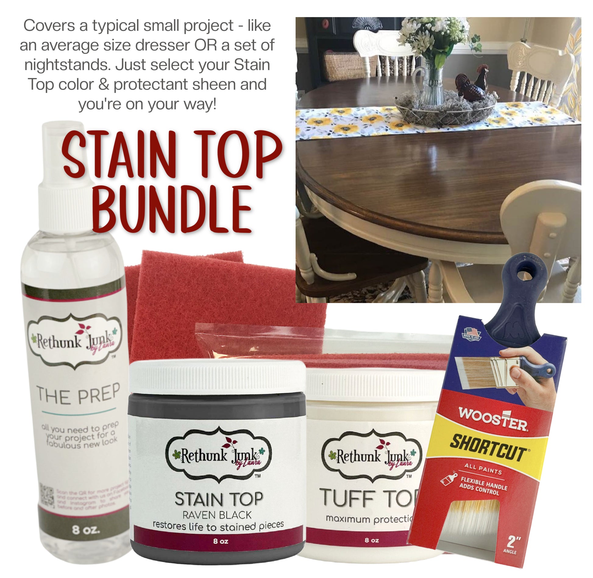 One 8oz Prep; One 2-pack of Scrubby Pads, One 8oz Stain Top, One 8oz Tuff Top and One 2″ Wooster Shortcut Brush.